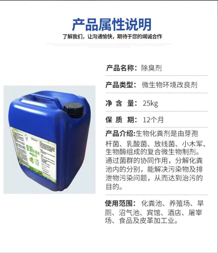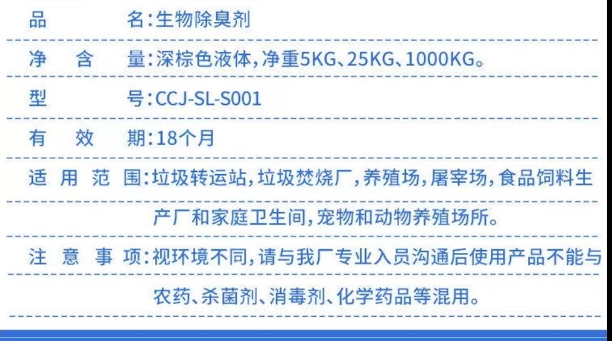 微生物除臭剂使用销售西安销售植物除臭剂西安西宝除臭剂厂时间:2023-03-02 西安销售电话:13772545818,13309267323 一、产品概述及适用范围: 1、产品概述: 本产品是活性酶组成,对人体和动植物无副作用,对环境不产生污染。扩散过程会对环境空气产生去味、消异味的功效。 2、产品除臭原理及特点 除臭剂的有效成分是由植物乙酸、丙酸、戊酸、木香油、4-甲基戊酸、酚等多种含氧小分子化合物组成,能有效去除因蛋白质腐败产生的氨气、硫化氢恶臭气体,除臭率和抑蝇率达90%以上;这些含氧小分子化合物能够对有害微生物细胞膜具有穿透能力和对有害微生物细胞刚壁具有破坏能力。 3、适应范围 垃圾中转站、垃圾填埋场、动物尸体无害化处理厂、垃圾焚烧厂、污水处理厂、粪便消纳站、公共厕所、大中型养殖场、屠宰场。 二、使用方法: 1、本品稀释100-200倍后搅拌对恶臭处进行直接喷洒能立即除去臭味。 2、本产品作业时无需穿戴和佩戴特殊防护,不会对环境造成危害。 一.产品介绍: 微生物除臭剂是由光合细菌、放线菌、乳酸菌、酵母菌、芽孢杆菌、消化酶等益生菌及代谢物组成,可氧化分解多种有毒有害污染物、净化水质、改善环境。营造良性的生态环境。 二.功能作用: 能有效去除硫化氢(H2S)、氨气(NH3)等恶臭气体,抑蝇率、除臭率达90%以上;显著降低污水中的COD和氨氮的含量,增强污水的净化速度和能力,对人体和动物无任何毒副作用,可净化空气,美化环境,提高生活品质。 微生物除臭剂 三.使用范围: 生活垃圾场所、垃圾处理场、禽畜养殖场、填埋场、屠宰场、食品加工厂、淀粉厂、污泥池、景观水域、公共厕所、化粪池、河水、湖水、宾馆、酒店、餐厅、厨房、家居室等产生异味的任何场所。 四.使用方法: 1.现存垃圾强化除臭:除臭液按1:100进行混合稀释喷洒,每平方米垃圾裸露面喷洒1斤。夏季每天喷洒1-2次;冬季每2-3天喷洒1次。 2.渗滤液除臭:按渗滤液收集池的渗滤液存量,每立方米用0.2公斤除臭剂,稀释10倍后喷洒入池中。10天内须喷洒3次,以后每7天喷洒一次; 3.养殖场除臭抑蝇 ①圈舍除臭:将除臭剂稀释10-30倍,用喷雾器均匀喷洒圈舍各部位。开始每周喷洒2-3次,臭味减轻后每周1次,之后每月喷雾2-3次即可。 ②化粪池除臭 现有粪便除臭:根据化粪池现有粪便的容量,按千分之一的比例稀释10倍后,均匀喷洒入池中。3天内须连续喷洒3次,以后按万分之一的比例,每7天喷洒一次。新排入粪便除臭:根据化粪池每天收集的新粪便的数量,每立方米粪便加0.1公斤除臭剂,稀释10倍后喷洒。 4.富营养化污水除臭:根据水质,以一定浓度的除臭净化剂均匀喷洒。每吨水的菌剂用量为0.01-0.05公斤之间,7天内连续处理三次。三次后,水质明显好转时,20-30天处理一次。 5.有机污水除臭:按每吨污水加入0.01-0.1公斤除臭剂稀释10倍进行喷洒或从污水排出口均匀加入。 五.注意事项: 1.本品是微生物制品,通过微生物活性物质分解除臭,无毒、无副作用、无残留、无二次污染。 2.不可对本品加热,不可与化学消毒药物混合使用。 3.避光阴凉处保存,保存及适用环境温度为0°-60°。 4.久置后底部产生棕褐色沉淀、属正常现象,不影响效果,使用时摇均即可。 |