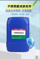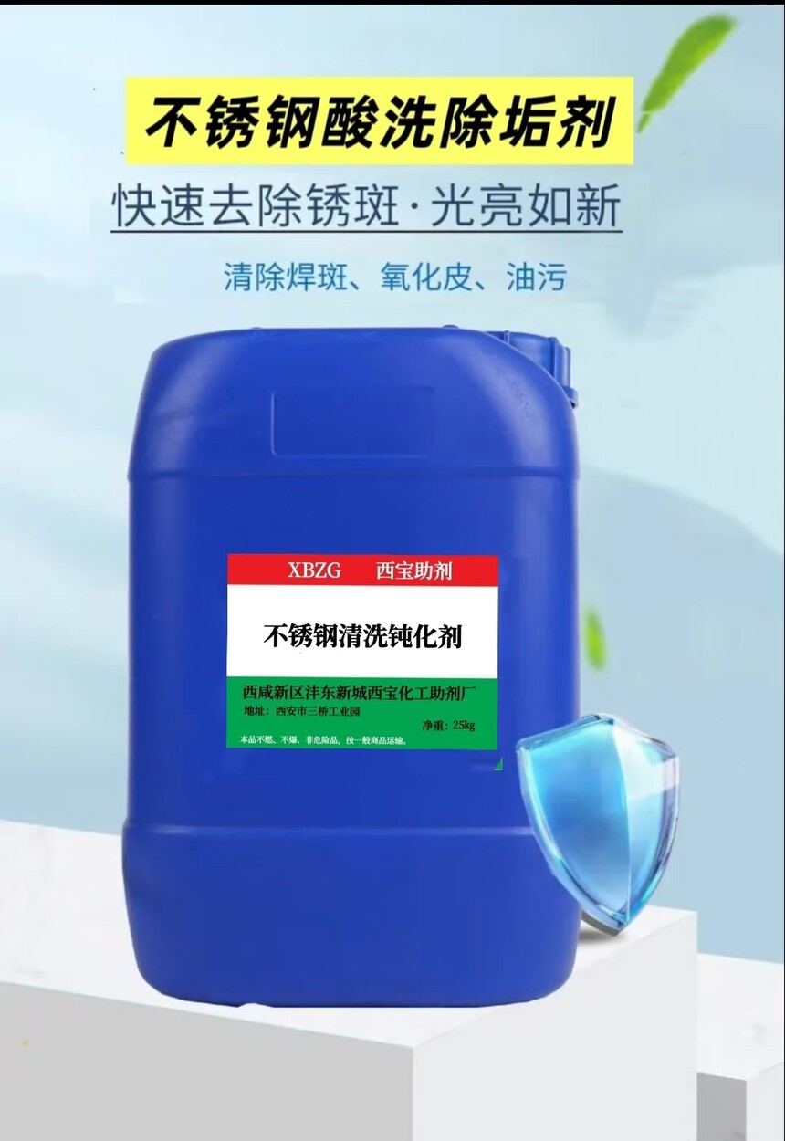 西安不锈钢清洗剂销售电话:13772545818, 13309267323, 品 名:不锈钢水垢清洗剂 性能用途:本产品为液体制品,由除垢剂、渗透剂、缓蚀剂等复配而成,它可以清除碳酸盐、硅酸盐、铁锈等污垢。本产品适用于不锈钢容器、换热器、蒸发器等不锈钢设备。 使用方法:本产品建议使用浓度为15%-25%,具体用量根据实际情况确定。使用时先向系统中加入计量好的水,再加入配备的缓蚀剂,缓蚀剂浓度为清洗液总质量的0.3%,后加入计量好的清洗剂,可采用循环或浸泡清洗。 包装贮存:采用25kg塑料桶包装或根据客户需求而定。常温存放于阴暗干燥处。 安全防护:为酸性产品,操作时注意劳动保护,应避免与皮肤、眼睛等接触,接触后用大量的清水冲洗。